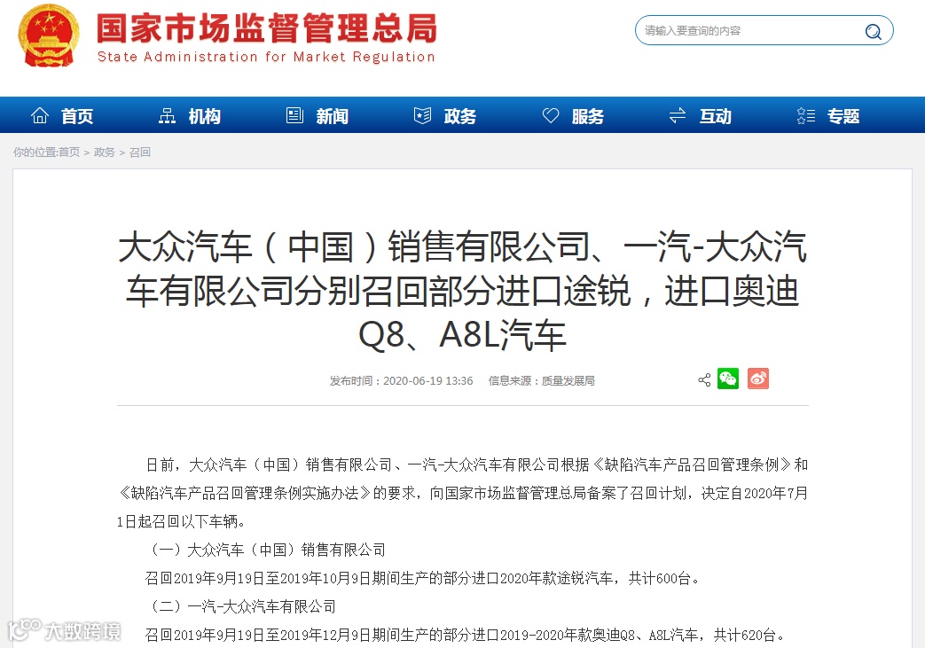 召回2019年9月19日至2019年12月9日期间生产的部分进口2019-2020年款奥迪Q8、A8L汽车,共计620台。
