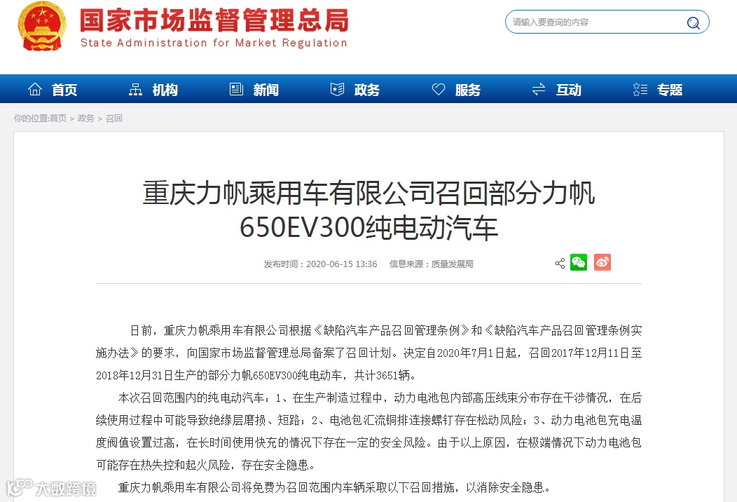 决定自2020年7月1日起,召回2017年12月11日至2018年12月31日生产的部分力帆650EV300纯电动车,共计3651辆。