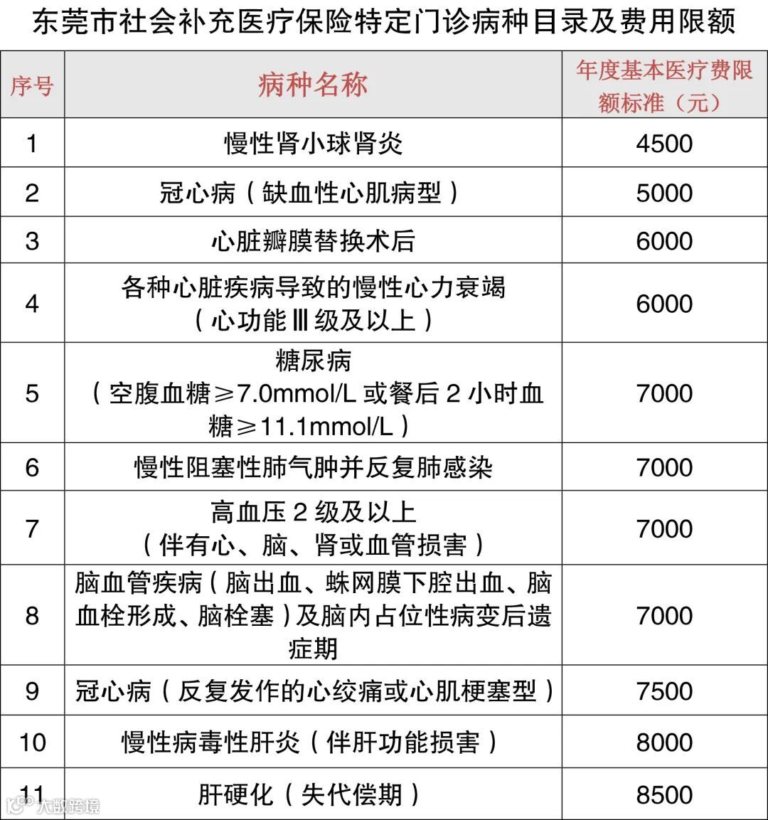 持有社保卡金卡的市民还可享受东莞市社会补充医疗保险特定门诊病种(有11种,即持金卡市民可享受38种),年度基本医疗费限额标准从4500元到8500元不等(如下图)。符合标准享受对应金额报销。
