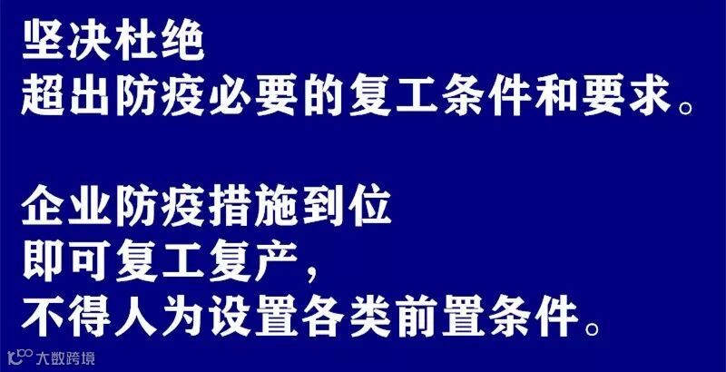 一、坚决杜绝超出防疫必要的复工条件和要求。疫情防控工作启动以来,广大企业自觉响应政府号召,认真履行主体责任,努力克服自身困难,主动承担社会责任,共同构筑了我市疫情防控的“四道防线”。各镇街(园区)、各部门要坚决纠正偏颇和极端做法,在严守输入性风险的前提下,彻底清理对企业超出防疫必要的复工条件和要求。明确企业防疫措施到位即可复工复产,不得人为设置各类前置条件。