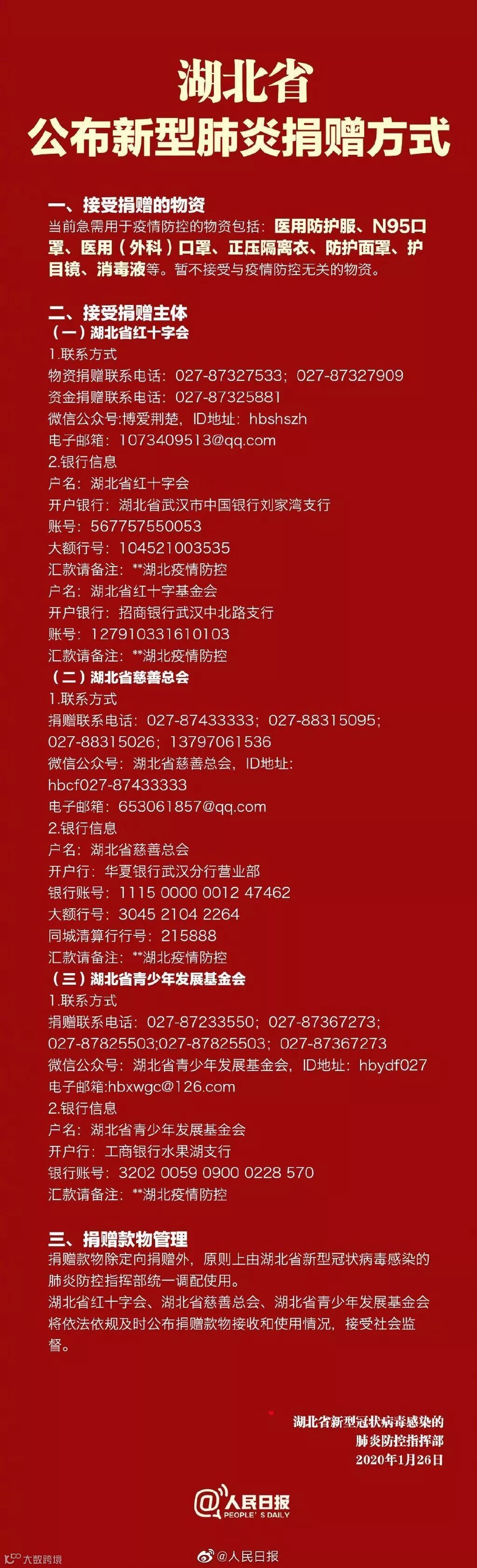 湖北公布新型肺炎捐赠方式