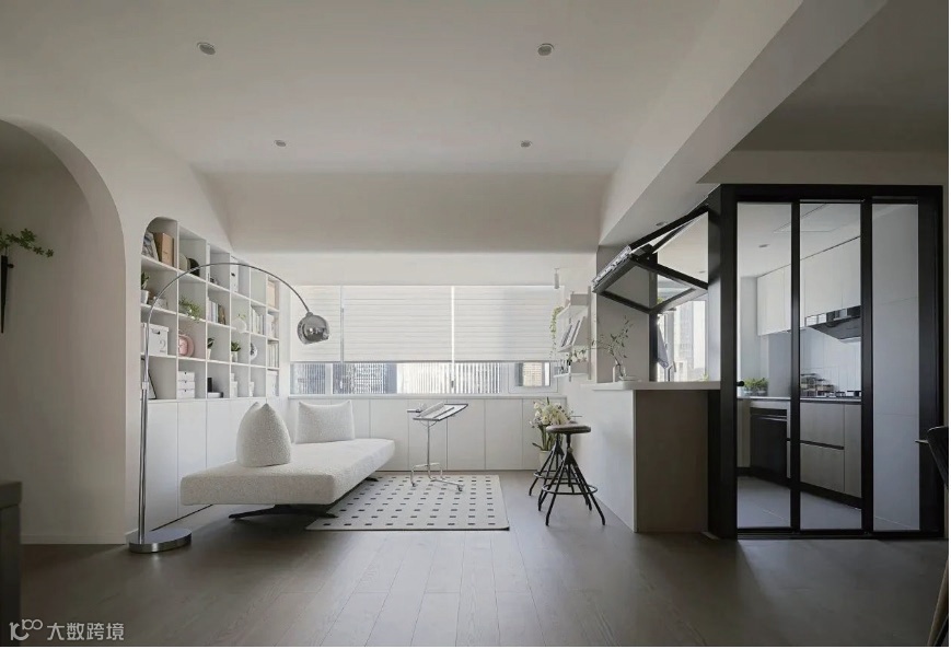 定制柜增加开放格,在全屋定制阶段可以提前布局猫咪活动空间。可以做成全开放形式,增加采光和透气性;也可以做成半开放。在柜门上掏洞的形式,给猫咪更安全的隐蔽空间。