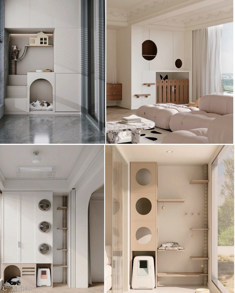 楼梯间除了储物还有很多有趣好玩的方式来处理,家里有宠物的业主可以把它打造成萌宠乐园,高低错落的层板满足他们日常活动。