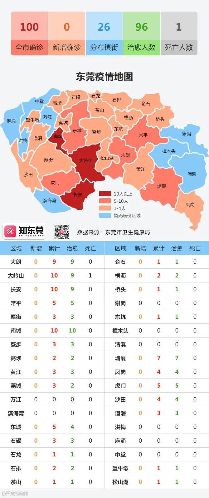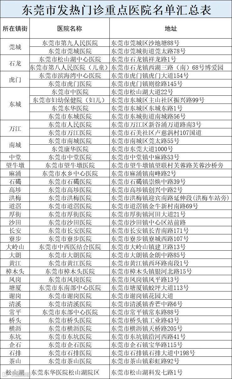 凤岗、沙田、大岭山、石碣、虎门、黄江、企石、道滘、南城、寮步、石排、大朗、塘厦、常平、厚街、横沥、高埗、东坑、石龙、松山湖、茶山、桥头、望牛墩等23个镇街(园区)已无在院确诊病例。
