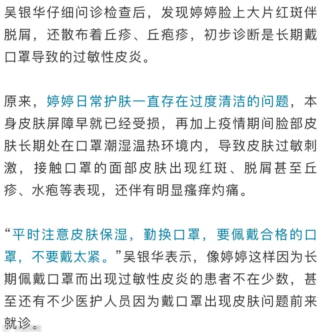 长时间佩戴口罩,会因呼吸使面部和口罩之间形成潮湿环境,皮肤长期处于潮湿状态,会发生浸渍,表现为局部皮肤变软、发白、起皱、脱皮等。预防: