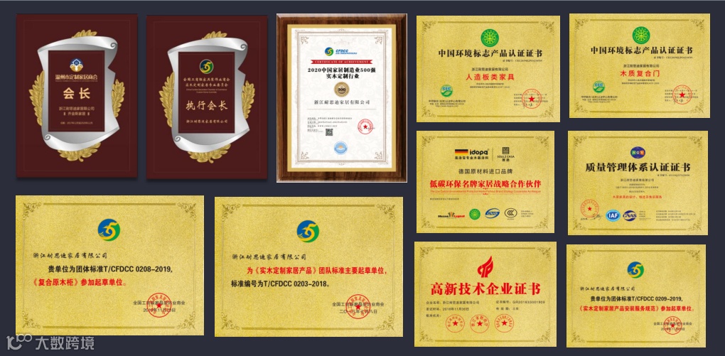 母公司在业界更享有良好的口碑,曾获得ISO9001质量体系认证、木质复合门、板类家具环境标志认证,被选为《实木定制家居产品》团队标准起草单位,也是最早获得环保十环认证及高新技术企业认证的企业。