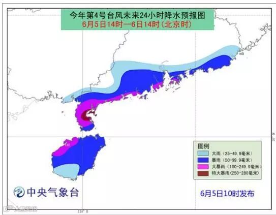 东莞市气象台6月5日16时25分发布台风白色预警信号:今年第4号台风(热带风暴级)15时中心位于我市南偏西约510公里的南海海面上,预计未来以10-15公里的时速向偏北方向移动,强度稍有加强,继续趋向粤西东部沿海一带。