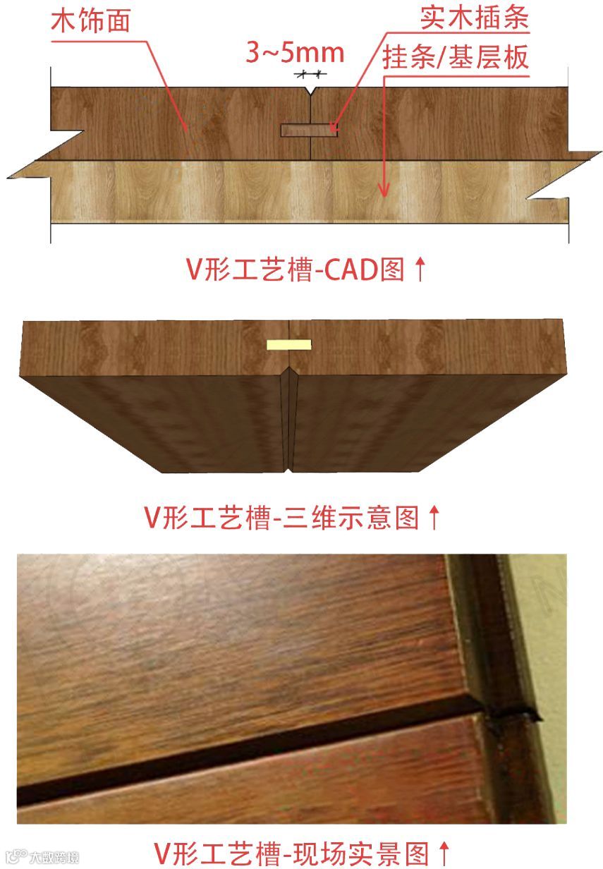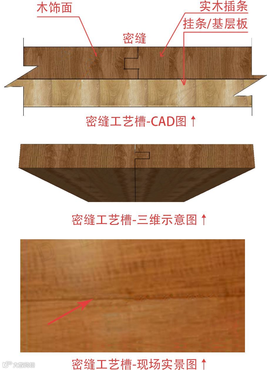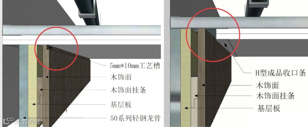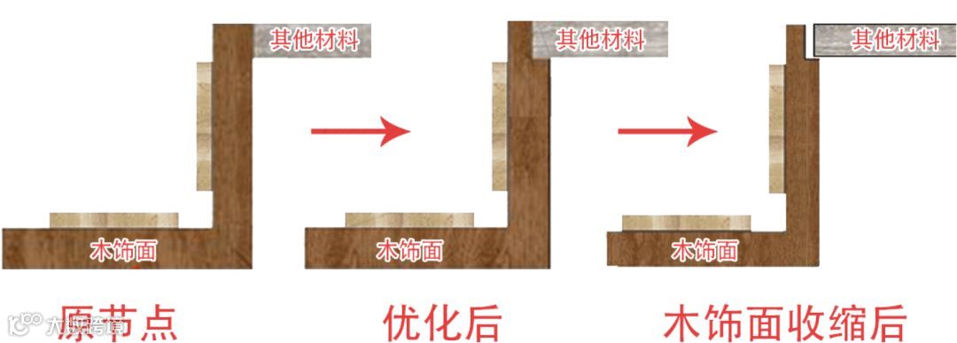 3、虽然木材的收缩是没法避免的,但是我们可以和木地板的做法一样,在节点图上,给木饰面的阴角留一些伸缩缝,保证它自身收缩后,不至于从表面就能看出来,就像下面这样优化;
