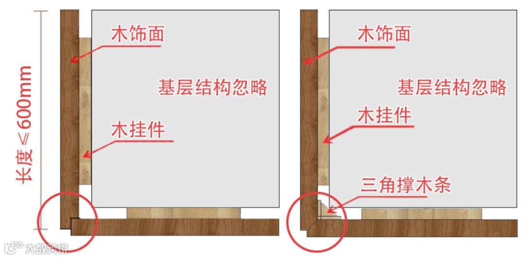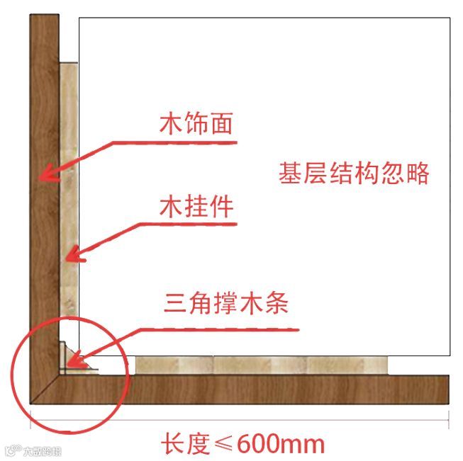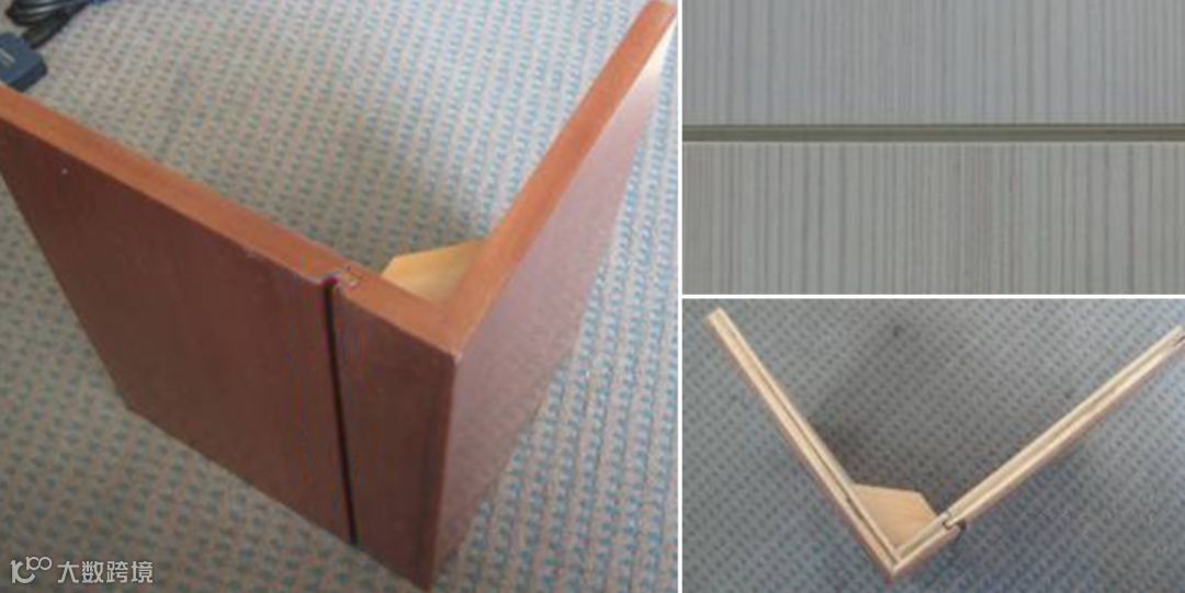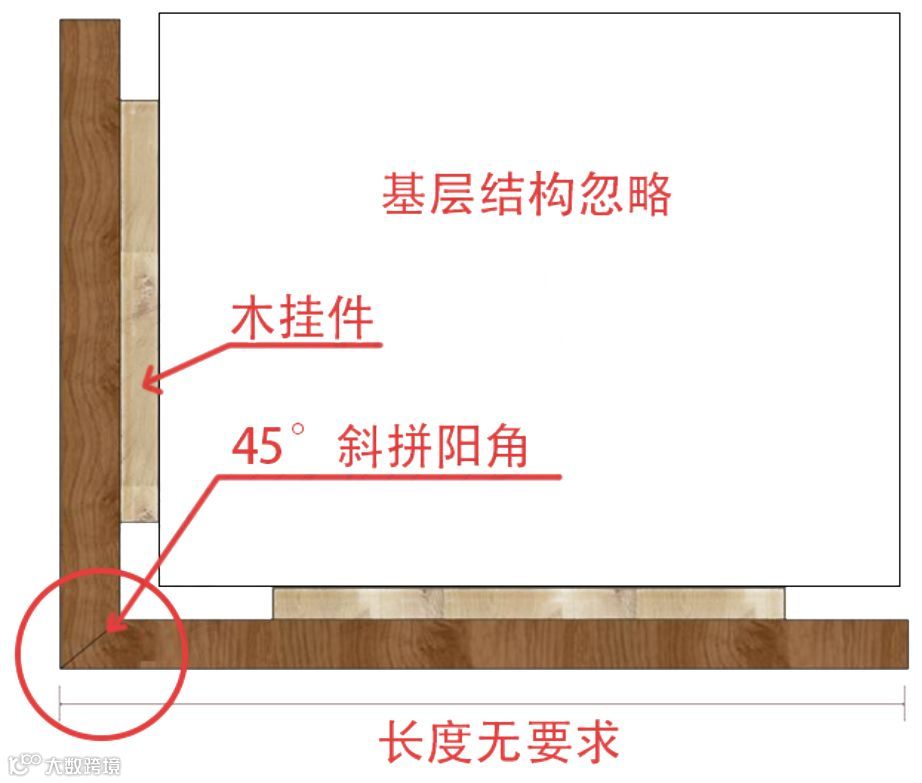 以上图片是木饰面最常见的阳角处开裂的情况,之所以开裂是因为在工厂制作,还是运输途中,以及现场的搬运及安装,木饰面的阳角一定会收到不同程度的磕碰,所以,如果没有对其阳角处进行加固处理,直接采用45°拼角,那么必然会出现问题的。所以,你可以这样进行优化;