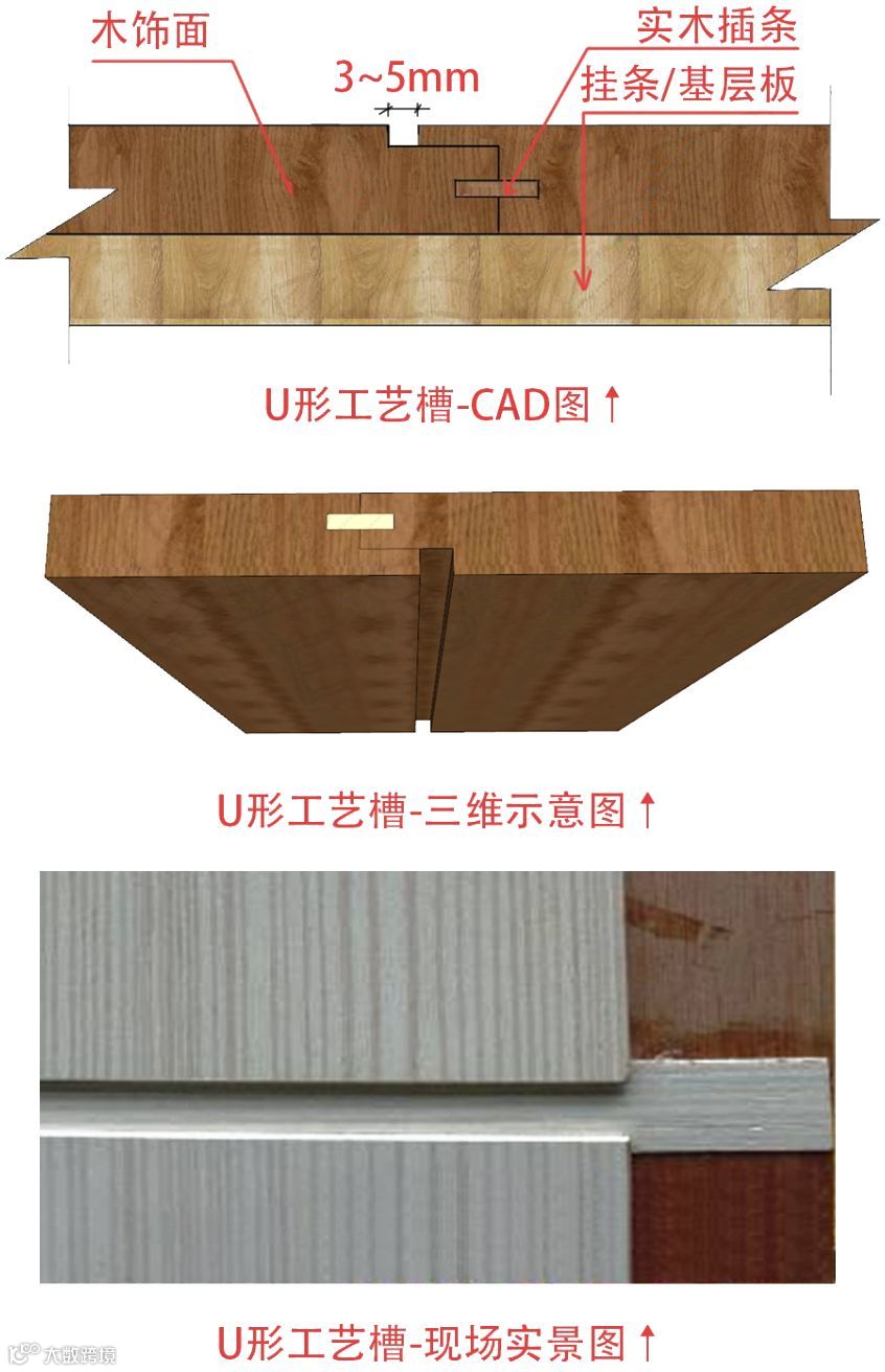 4.1、工艺缝尺度‹ 5mm时,只能做与大面相近的油漆来饰面,工艺缝≥5mm时,槽内则可贴木皮做油漆,所以,建议工艺缝的尺度≥5mm为宜。
