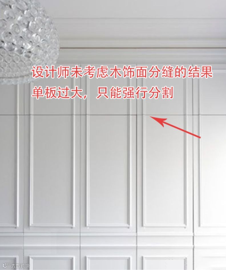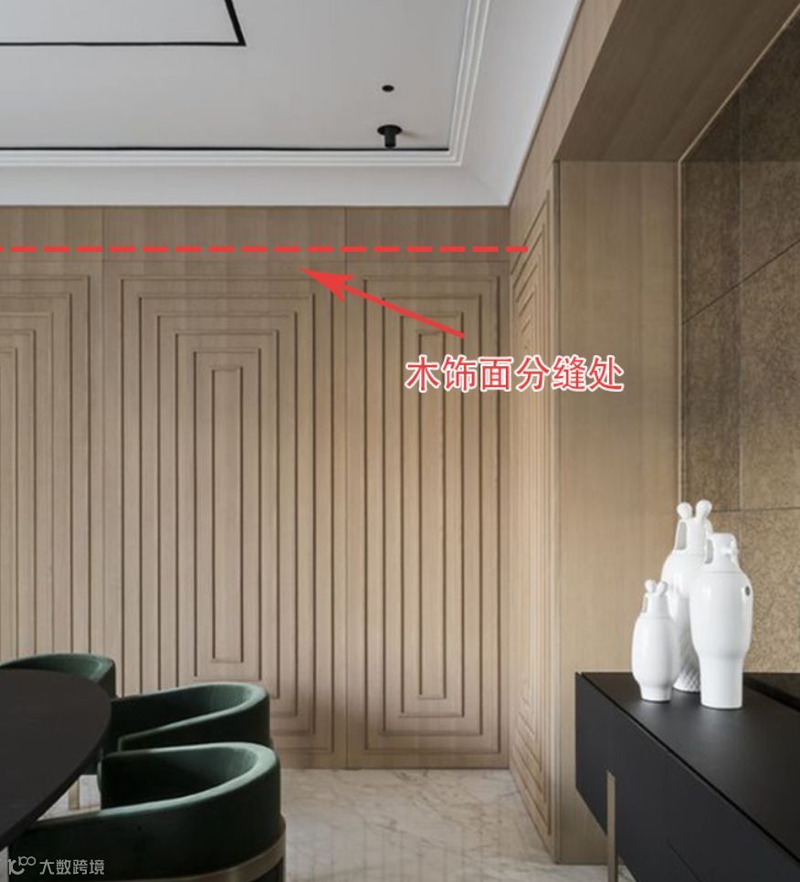 所以,在你的设计项目中,大面积采用木饰面时,一定要从最后落地的角度来控制木饰面进行工艺缝的预留,否则,项目落地后,木饰面的分缝必然会影响设计效果,因为,现场人员下单时,是不会考虑设计效果的,就如下图所示。▼