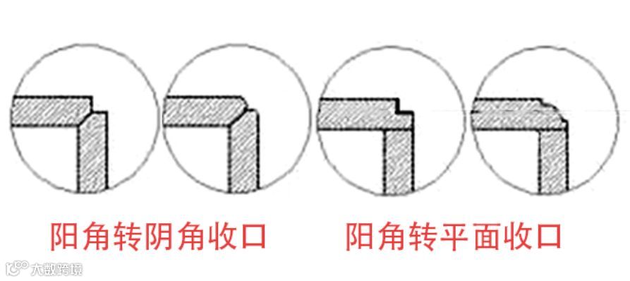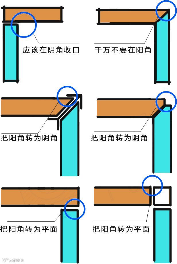 所有收口,尽量都在阴角,哪怕在平面上收口,也千万不要在阳角收口。如果不得不在阳角收口时,也要想办法把阳角转换成平面或者阴角。