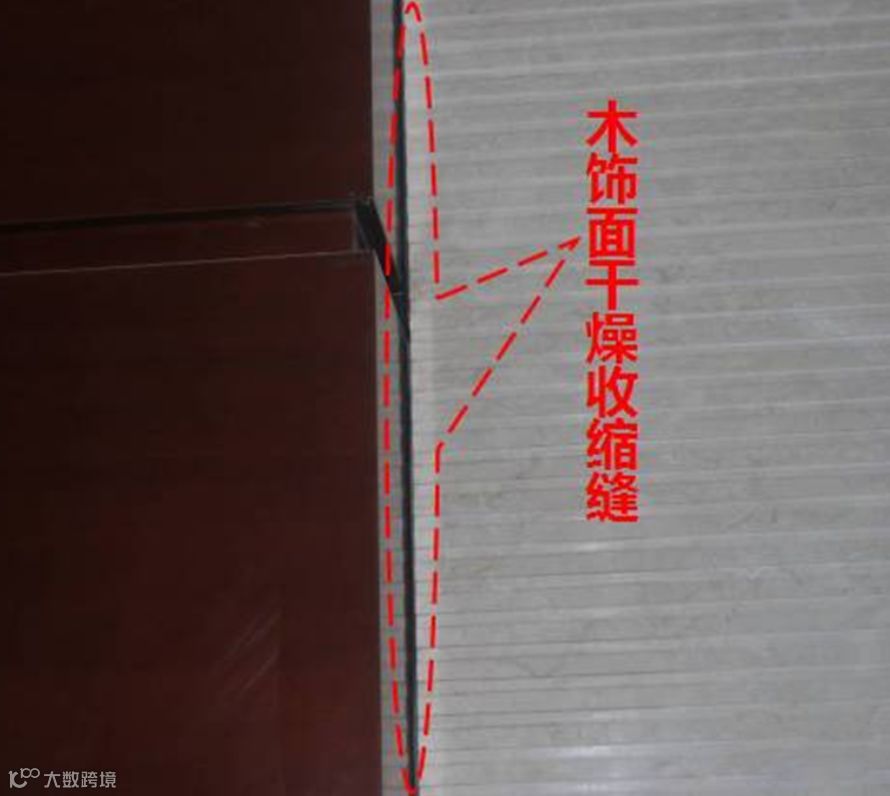2、但是,这样做会有新的问题出现,即木饰面受外界温度的影响,导致含水率的不稳定,从而形成收缩缝,最后导致阴角出现空洞的情况发生。如下图所示: