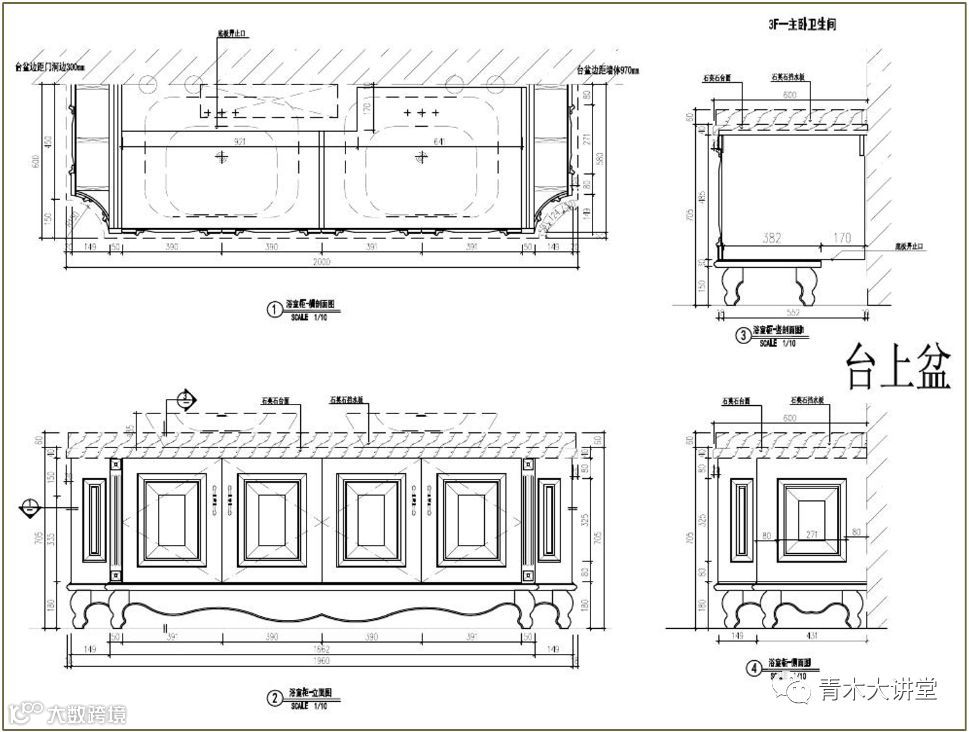 4.台盆柜分台上盆,半台上盆和台下盆三种,不管哪种,记住,国内设计标准都是台盆的上口离地面高850mm,这样根据水盆的高低就可以设计台盆柜了。
