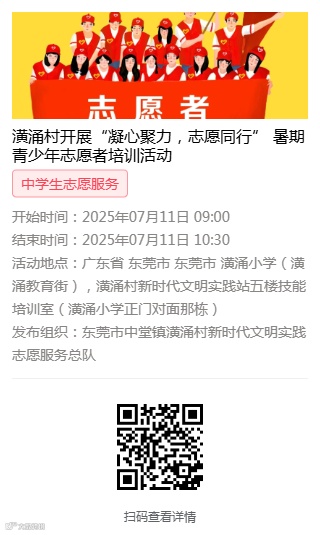 以上是成功报名潢涌村开展“凝心聚力,志愿同行”暑期青少年志愿者培训活动名单,请名单上的人员扫描以下二维码进行i志愿报名。(如i志愿未实名认证的人员需先在i志愿平台进行实名注册)