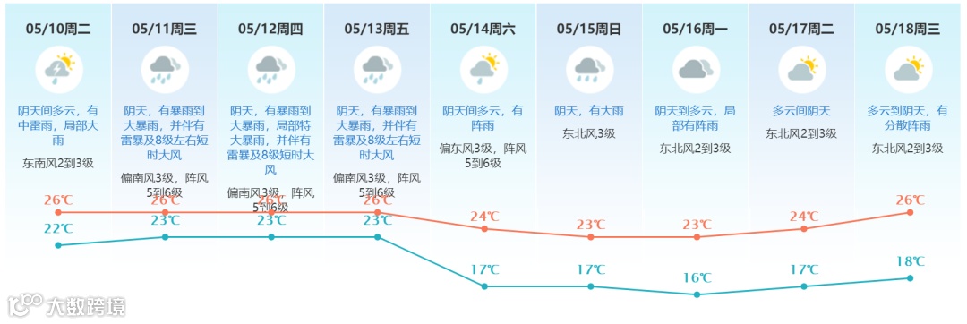 5月10日:阴天间多云,有中雷雨、局部大雨,气温23到27℃,东南风2到3级;