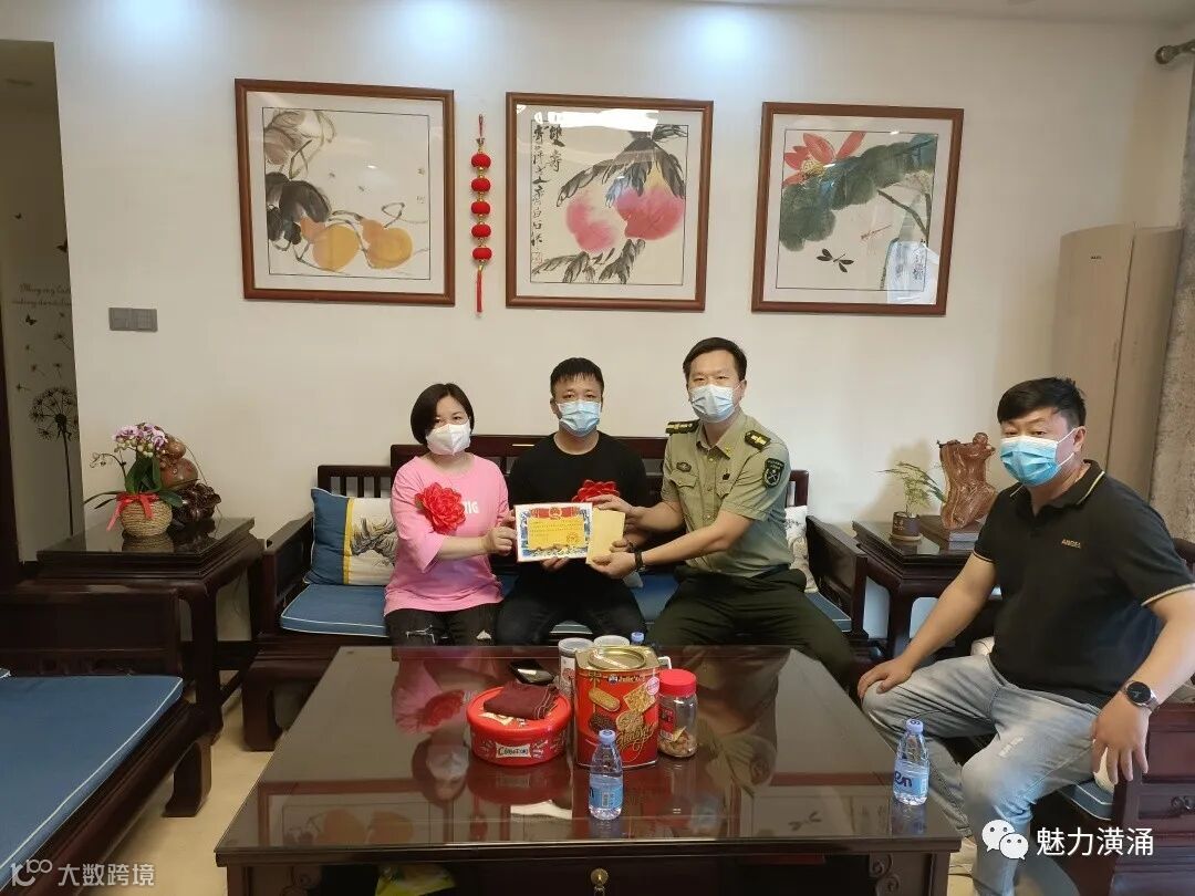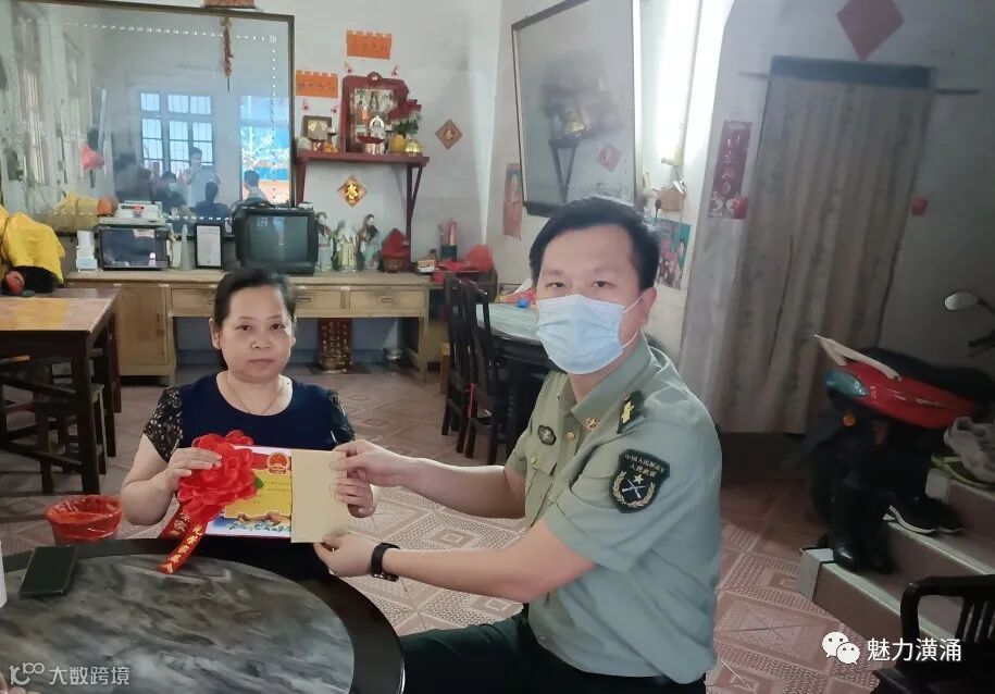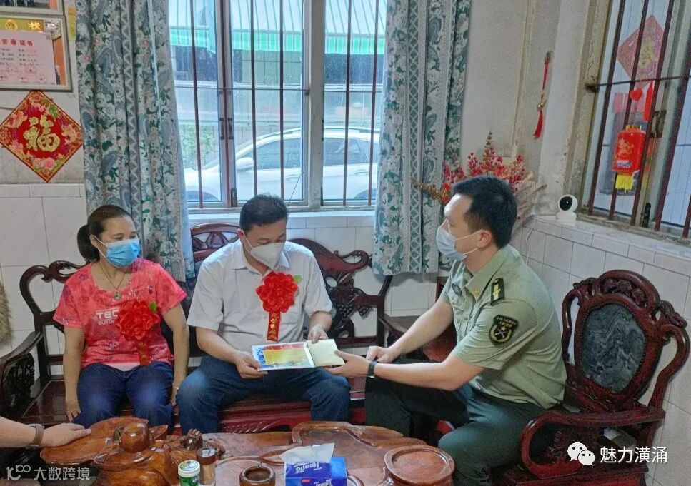 ▲村党委委员、村民兵营营长黎景杨到3名新兵家中送上