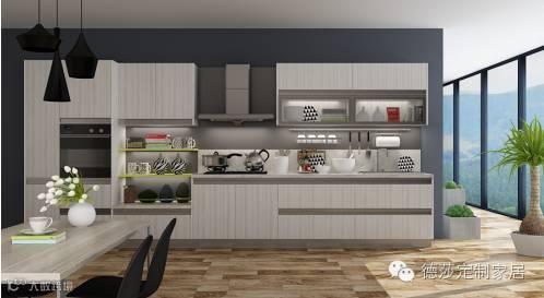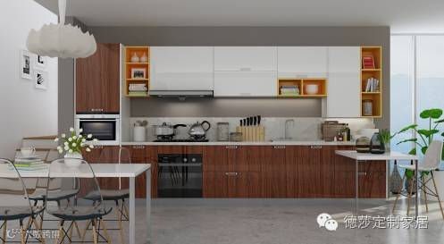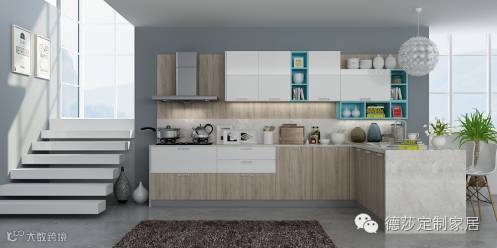 亚克力——大量的高柜设计,配以适当的开放柜,清新的天蓝色让喜欢现代气息的年轻消费群体直观感受,厨房也可以“高大上”!