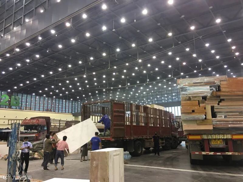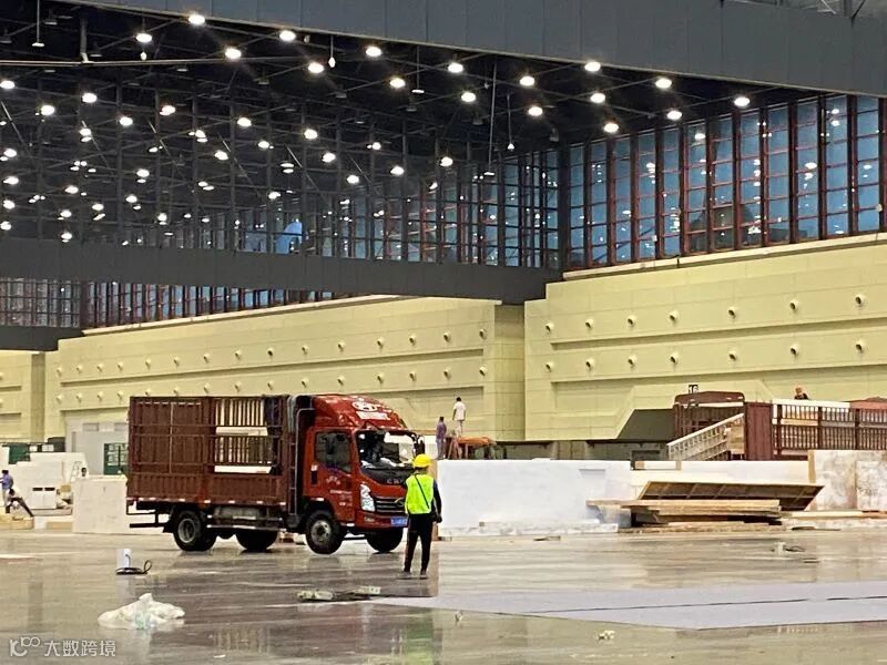 参展企业一辆辆满载参展物资的货车驶入展馆,展厅内,现场一片繁忙景象,各个展区的展台搭建如火如荼,工人们在展位上热火朝天地工作,进行展台主体结构的安装搭建,所有人员都在抢时间、赶进度,争取在开展三天完美呈现。