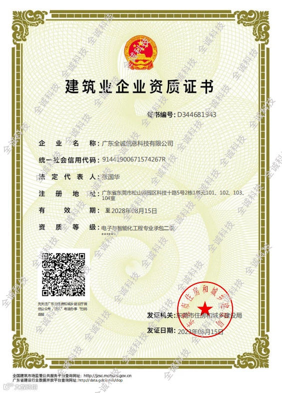 近日,全诚科技顺利取得“电子与智能化工程专业承包二级”资质证书,该资质的取得标志着全诚科技现已拥有承担各类大型电子工程、建筑智能化工程、电子系统等大型工程项目施工的资格与能力,为公司开拓电子与智能化工程领域市场奠定了坚实的资质基础,是公司发展史上的又一重要里程碑!