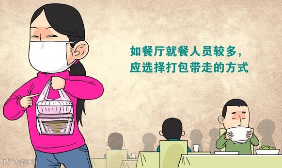 多人围桌用餐时,提倡使用公筷公勺或实行分餐制,尽量缩短就餐时间,减少同行人员之间的交流。如餐厅就餐人员较多,最好选择打包带走的方式。