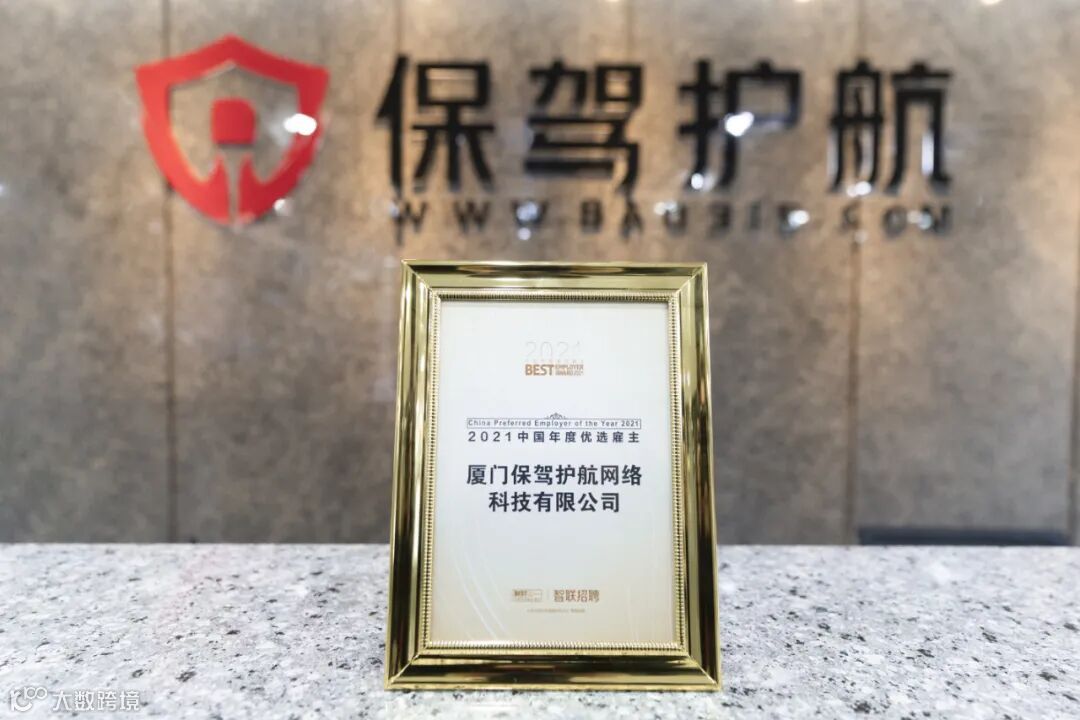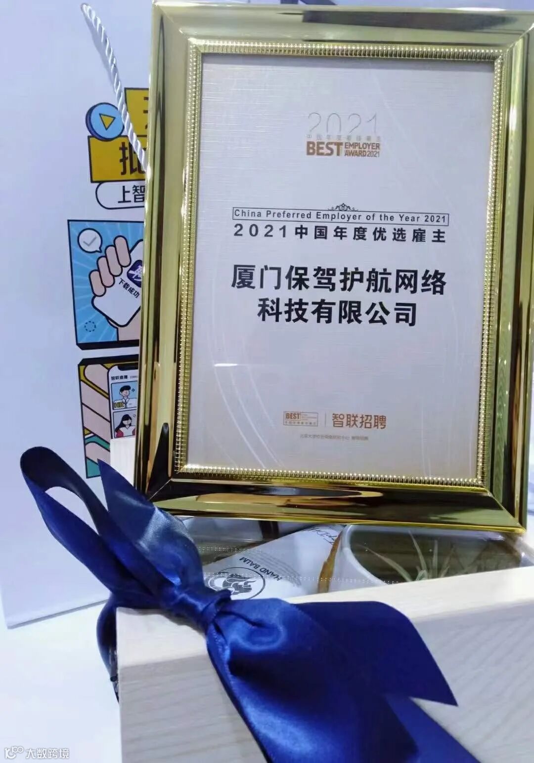 2022年01月11日,由智联招聘主办的“Hi,液态职场”2021中国年度最佳雇主颁奖典礼上,厦门保驾护航网络科技有限公司从众多参选企业家中脱颖而出获得“2021中国年度最佳优选雇主”!