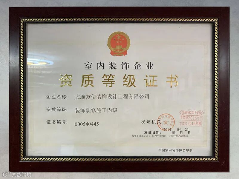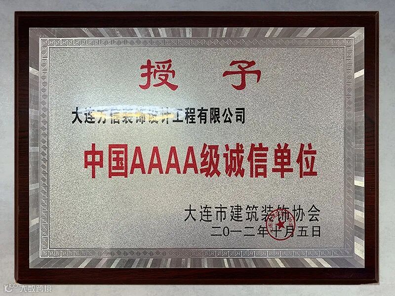 方信装饰以其优质的服务和装修设计品质,先后获得“中国AAAA级诚信企业”、“优秀家装企业”、“守合同重信用单位”、“辽宁省绿色环保装饰公司”等荣誉称号。