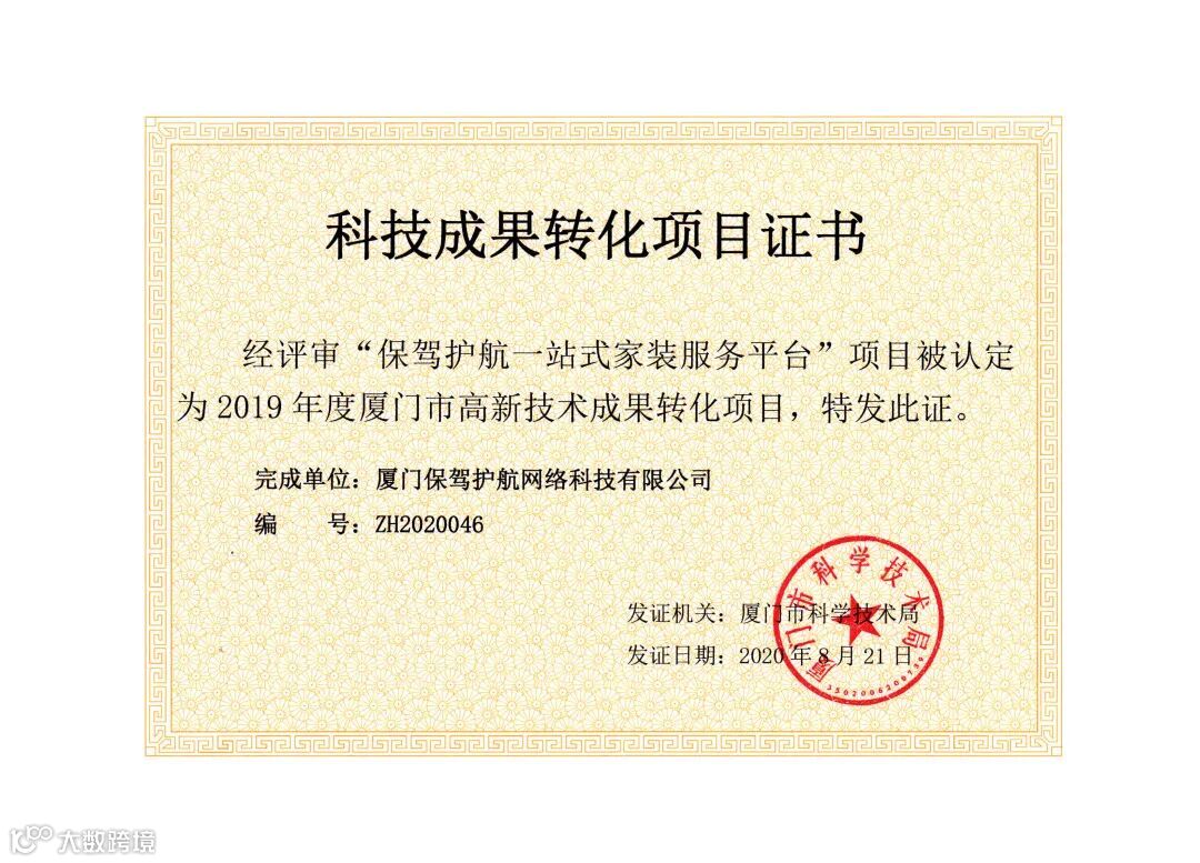依据中共厦门市委、厦门市人民政府《关于实施高技术高成长高附加值企业倍增计划的意见》(厦委发[2019]17号)及《厦门市促进科技成果转移转化若干规定操作规程》(厦科发计[2018]13号)文规定,经过厦门市科学技术局专家审核评比,我司申报的“保驾护航一站式家装服务平台”项目,被认定为“2019年度厦门市高新技术成果转化项目”并获颁荣誉证书。