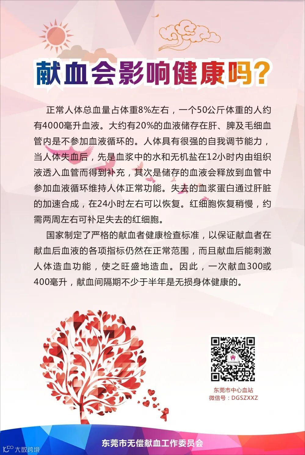 无偿献血是救死扶伤的崇高行为,是团结、博爱、互助的集中表现。您知道吗?每次献血300~400毫升,仅占人体总血量很少一部分,我们身体具有很强的代偿能力,每半年献血一次,不但无损健康,而且还可以增强血细胞的新陈代谢能力,促进身心健康。血脉之情大真大善大美,无私真爱至高至上至纯,生命之源把你、我、他紧密相连,用自己的热血延续他人的生命,将是一生的荣耀!