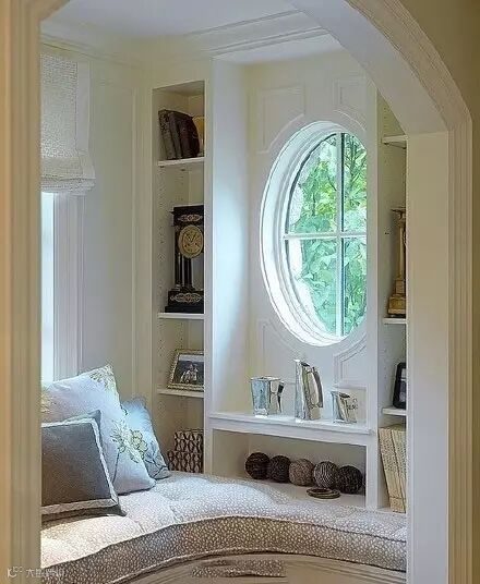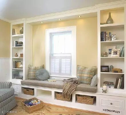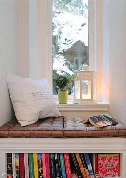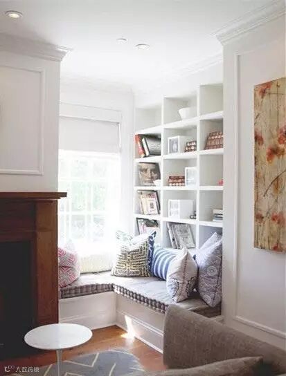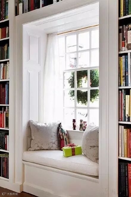 在飘窗周围做几个柜子,完成了日常所需的储藏空间,然后在展示柜上放上满满的书,就像进入图书馆一样。睡前拿本书看看,看累了往柜子上一放就可以小憩一会。