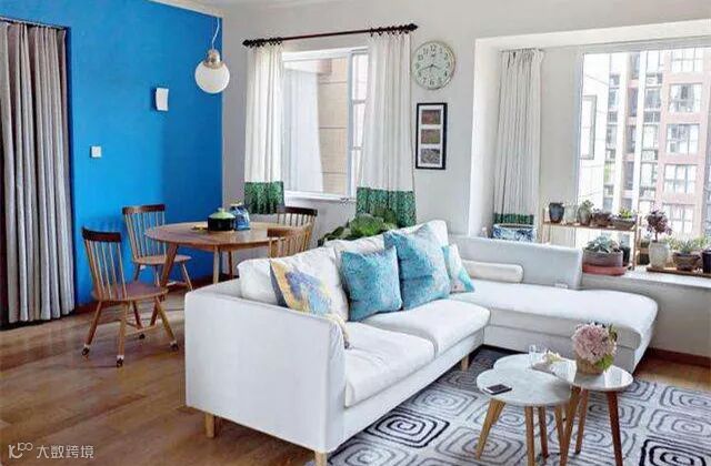 通常,大家都喜欢把沙发靠墙放,既节省空间又感觉有安全感些。但对于这样的房型,显然沙发靠墙就不太现实了,可以在沙发背后放矮柜,矮柜上摆放装饰品也是不错的选择,这样沙发背后也有靠山了。