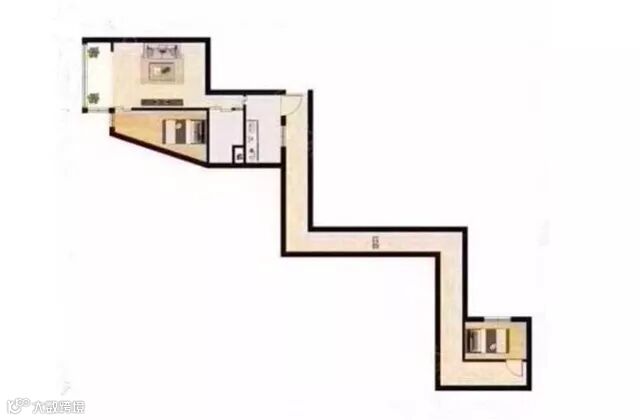 奇葩户型中,除了走廊过长外,房型不正也是常常遇到的一种情况。一般边角位置的房子,需要配合楼体造型,难免在房型上就会有些“委屈”。