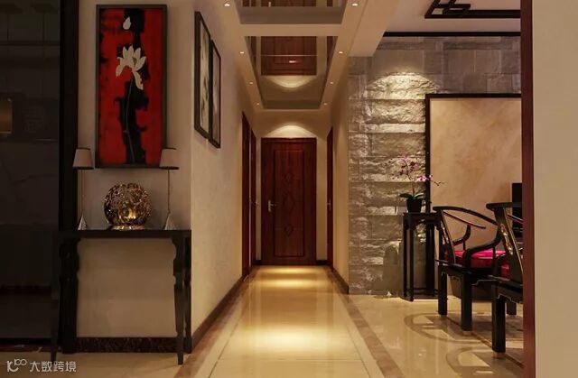 (1)利用照片墙、装饰层架进行装饰,来“缩短”过道。