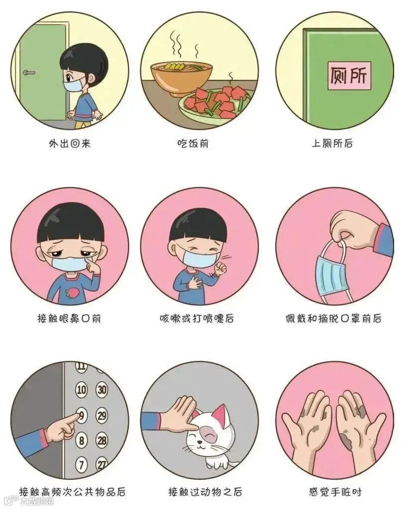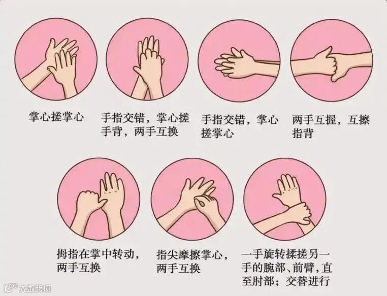 按照七步洗手法,使用流动水、肥皂或洗手液洗手。外出回来、饭前便后、咳嗽或打喷嚏后,需要及时洗手。