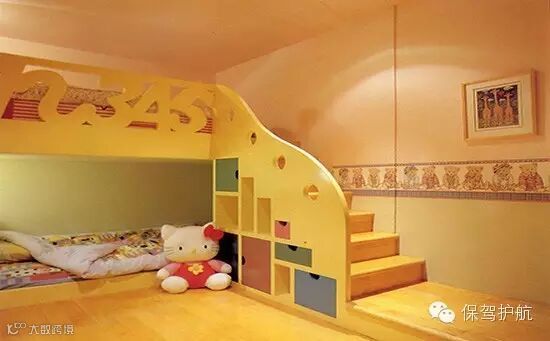 这个双人儿童房设计,收纳功能齐全,还兼具书房功能。两个小孩睡觉的时候还可以互相看得到。对于缺乏安全感,怕黑的孩子来说这样的设计不错。但是有个问题,楼梯设计不是那么安全方便,尤其对于较的小孩子来说。