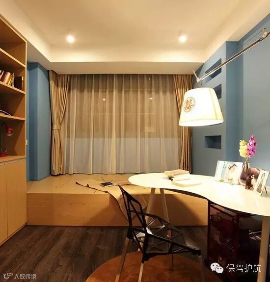 书房是个严肃认真的地方,这个书房却选用了天蓝色,让这个空间不那么拘谨。即使不看书的时候在地台上喝茶下棋也是不错的选择。