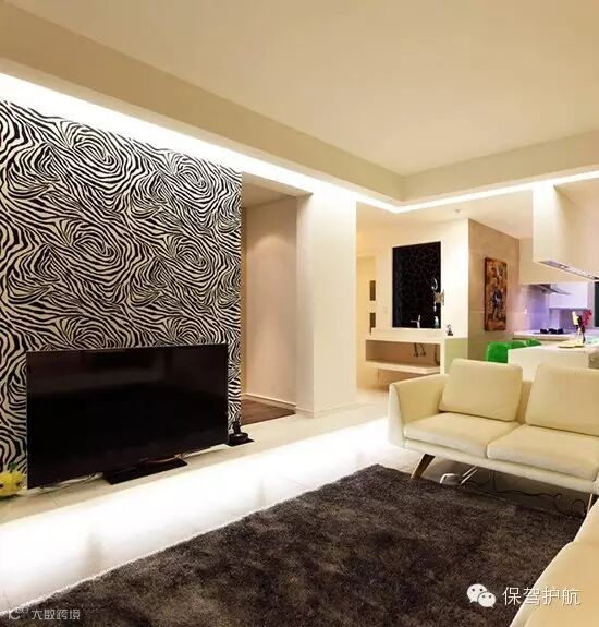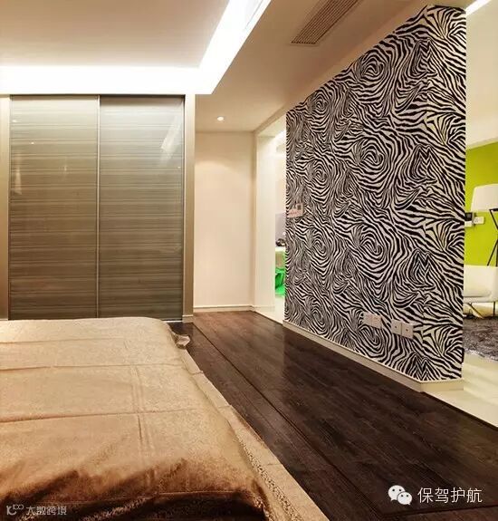 斑马纹的墙纸起到了背景墙和隔断的双重作用,把客厅和卧室做了分割。整个卧室做了抬高,所以没用任何主灯,而是用柔和的灯带来照明。
