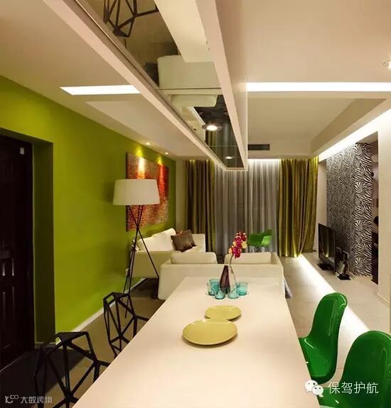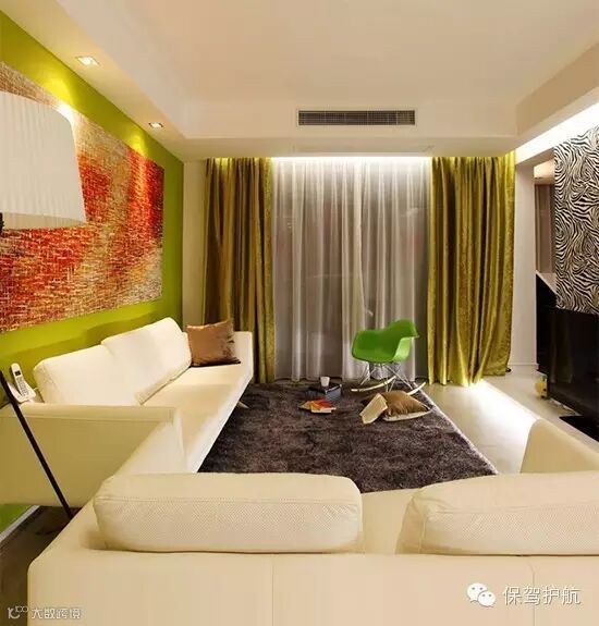 客厅的背景墙大胆的选择了果绿色,顿时让沉闷的空间变得生机盎然。