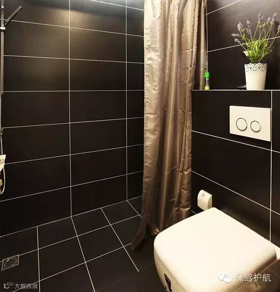 黑色调为主的卫生间,足够小,所以做了干湿分离的处理,将台盆搬到了卫生间门外,将女主人最爱的浴缸搬到了卧室内阳台里。