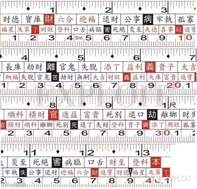 做生意一般取财字,不能用【义】字,太讲义气,生意无利可图。只适用于道上兄弟或宗教庙宇。一般阳宅取用如能阴阳两利(即门公尺、丁兰尺皆吉)当然最好,但大体取【财】与【本】之间的红字为准。【财】指财库,本指本源,也意味源源不断,通常取用尺法有如下规矩: