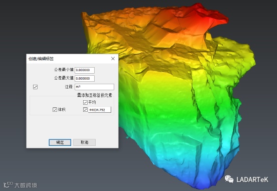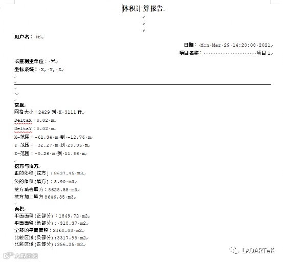 在后处理软件将无需参与计算的点云分割,保留计算点云,一键计算体积和表面积,并输出体积计算报表。