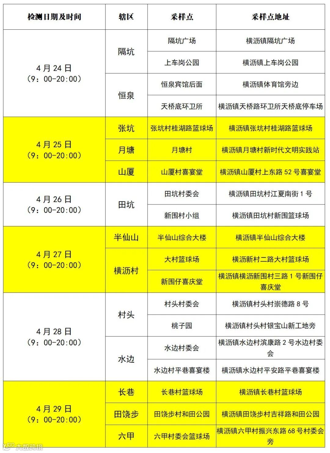 横沥镇 4月24日-29日 核酸重点检测安排
