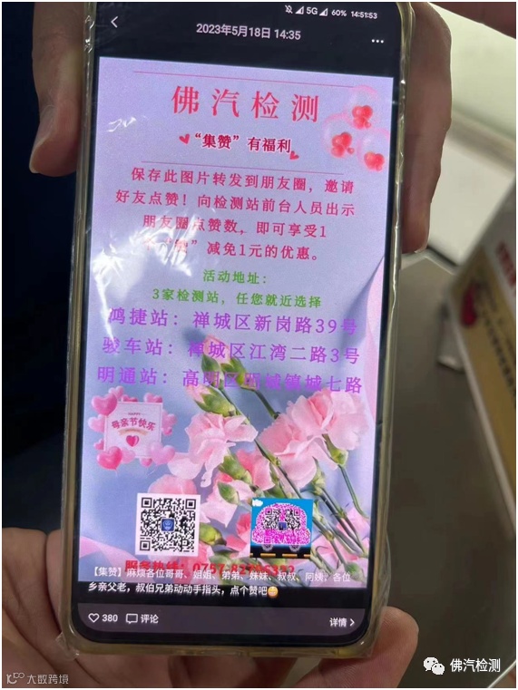 2023年5月26日下午,一位陈先生驾爱车到骏车检测站年审,转发我司的活动海报到朋友圈,动员圈内的朋友点赞,太给力了,集了380个赞,陈先生审完车到前台即可立减本次“全部审车费”。陈先生高兴地说,“你司的集赞活动的确很好,真实惠!以后我或朋友需要审车还会继续选择你们公司的。”