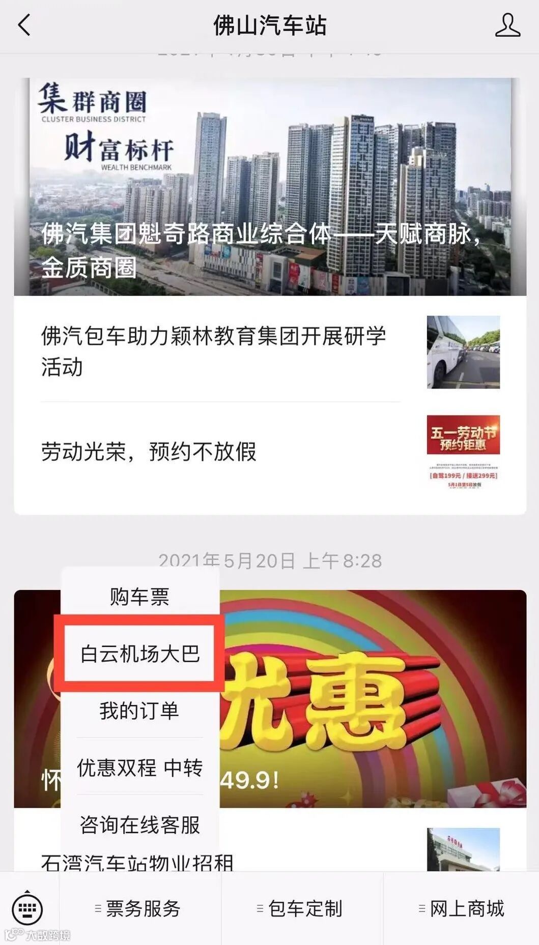 打开佛山汽车站微信公众号,点击“票务服务”,选择“白云机场大巴” 进行购票。