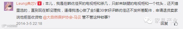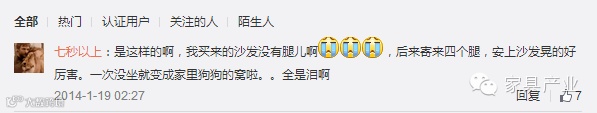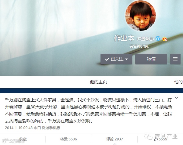 三天两头的,我们总会在各地媒体上看到消费者网购家具的痛,新浪微博大V@作业本也曾在微博上吐槽“千万别在淘宝上买大件家具,全是泪”,讲述其在淘宝买沙发遭遇的质量差、退货难、维权不易的遭遇,获得网友共鸣纷纷吐槽自己网购家具的血泪经历,转发5506次,评论2937条。