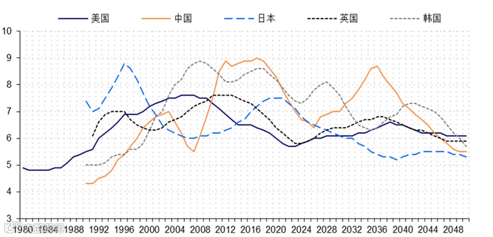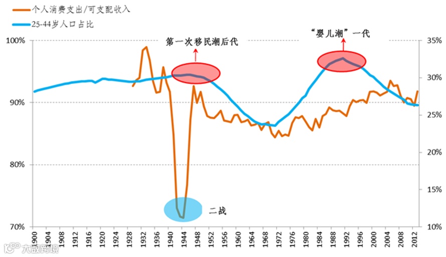 每一个国家的人口史各自诠释了消费的高潮跌宕。对应如上的消费生命周期,如果把不同年龄段人口占比时间序列与消费支出大致做一个对比,可以发现当青壮年人口占比达到峰值时,基本对应着消费支出的高点。以美国为例,20世纪以来,美国25-44岁人口有过两个小高峰,分别在40年代初和80年代末、90年代初期间,这两个时间段分别对应着20世纪初的第一次移民潮的后代以及二战后“婴儿潮”一代;而剔除二战特殊时期,可以发现个人消费支出占比可支配收入与25-44岁人口走出一致的趋势图(图表4)。