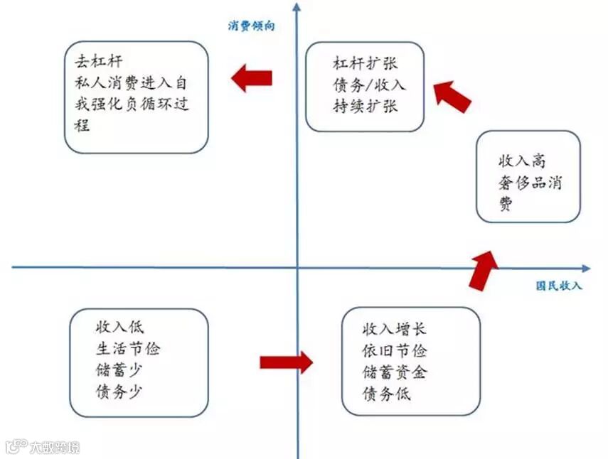Dalio在其国家生命周期循环中提出,一国有五个阶段:一国穷并自认为穷→迅速变富但仍认为自己穷→富有并自认为富有→变穷但仍认为自己富有→进入去杠杆和低增长。五个周期的更迭实质是国民收入和不同消费倾向的二维组合(图表1)。