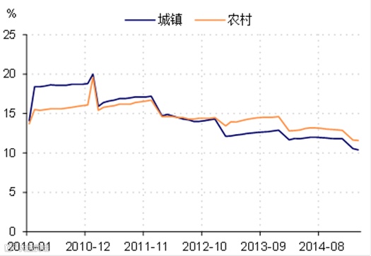 ·社会保障制度的不断完善提升居民部门加杠杆空间。从各成熟发展经济体居民部门杠杆率历史变化来看,不同国家的社会保障程度、信用环境以及消费文化的差异等因素决定了居民杠杆率的潜在空间,英国、美国的杠杆率高点较日本、德国等偏保守国家要高出10-20个百分点。中国目前的居民杠杆率水平(居民债务/GDP)还不到40%,仅仅和美国50年代末期和日本70年代水平相当(图表10)。偏低的杠杆率很大程度上与医疗、养老后顾之忧难消,形成了居民的强制性被动储蓄相关。金融体制改革推进、社会保障制度的完善或将使得在“富日子富过”阶段居民部门杠杆率的提升提供催化剂与安全网,居民部门将“有钱敢花、借钱敢花”。最为典型的是新农合对农村消费的外溢效应,新农合2003年开始试点,截止2013年参合率已经超过98%,补偿受益人次超过19亿人次。从社会消费品零售总额的数据看,自2012年底农村的同比增速已经趋势性超过城镇的社消增长(图表11)。