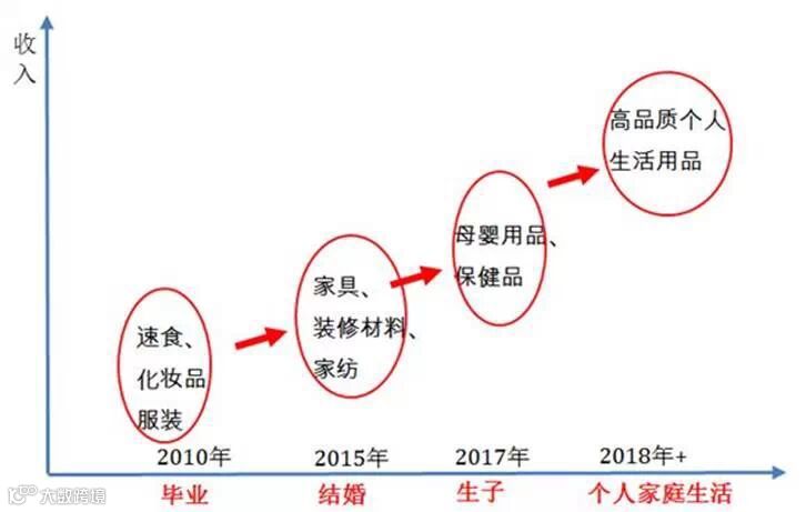 “Y一代”人生阶段的变迁带动不同消费品类的交替变化。以85年出生的这代人为例,在过去的两三年,这一群体正处于大学刚毕业、初步进入社会,带动的主要是个人消费品,淘宝网中的个人消费品,如化妆品和一些基础食品的销售增长较为迅猛;当到了购房、生子的阶段,即将发生、正在发生的增长最快的是如家居、装修品类、母婴类产品,以及家庭餐饮;接下来的两年应该是85后重视个人消费品快速成长的时代,待85成长到32岁(2017年前后)成为消费中坚力量时,品质的要求会驱动高价格、高品质、有调性的商品(图表21)。每当“Y一代”带动某一类消费品时,爱好品质与个性的他们都会向上抬升消费品的需求层级。