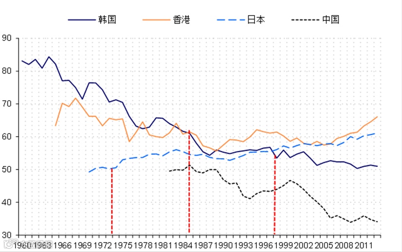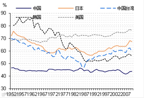 从国际经验看,一国的居民收入分配往往在经济快速发展时期呈现扩大态势,随着收入的提高,特别是城镇化的发展很有可能使得收入分配走向收敛。以韩国为例,从70年代中期开始的允许城乡间人口自由流动使得韩国的地区收入差距在30年内几乎完全消失,以首尔所在地区京畿道的人均GDP为基础,可以发现在各区人均收入在80年代快速收敛,以致在本世纪初基本相差无几(图表9)。近年来,居民收入在整个国民收入分配体系中的份额在不断提高。此外,金融和财政改革都有利于提高居民收入占比。例如,在金融抑制的时期,压低利率实际上形成了一种居民补贴企业的财富分配机制,导致国民收入分配不断从居民向企业和政府倾斜,金融自由化恰恰是对此种扭曲的财富分配的矫正。